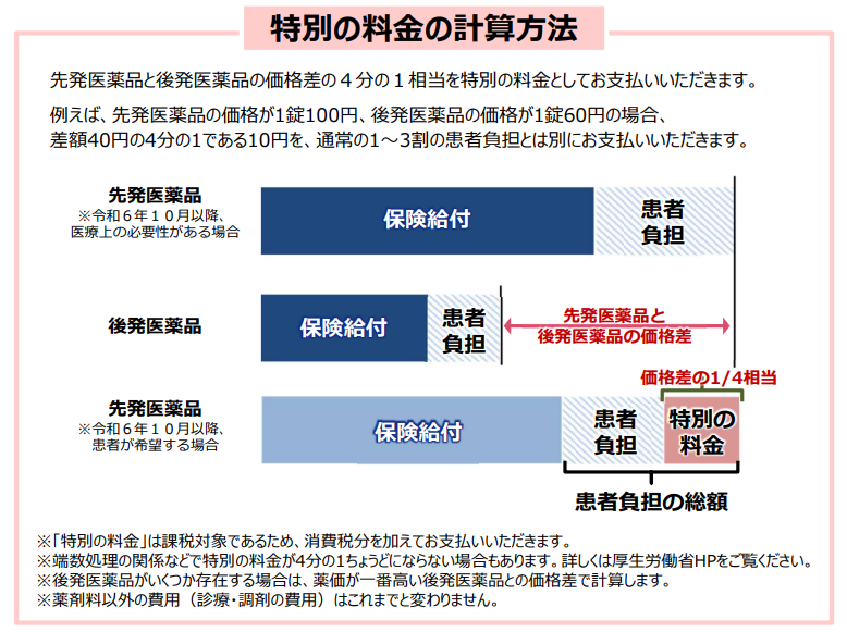 2024年10月より、ジェネリック医薬品があるお薬に対し先発医薬品(長期収載品)の使用を希望した場合、そのお薬の差額に対し一定程度の割合を患者さまにご負担いただく「選定療養」が始まりました、ご自身の服用されているお薬の「ジェネリック医薬品の有無」、「選定療養対象の可否」などご不明な点は、薬局スタッフにお気軽にお尋ねくださいませ。